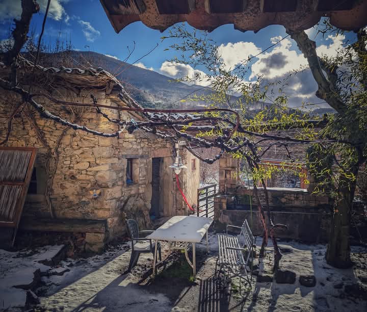 La terrasse, ombragée par sa treille, s’anime au rythme du murmure de la fontaine alimentée par notre source naturelle, véritable symbole de régénération, offrant un cadre enchanteur pour les repas partagés et la sobriété heureuse. Cet espace comprend également une cuisine, un salon et une salle de bain/WC.